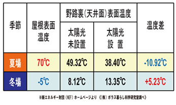 下記の表のとおり屋根の上に太陽光パネルを設置することにより屋根の断熱効果がでます。 |